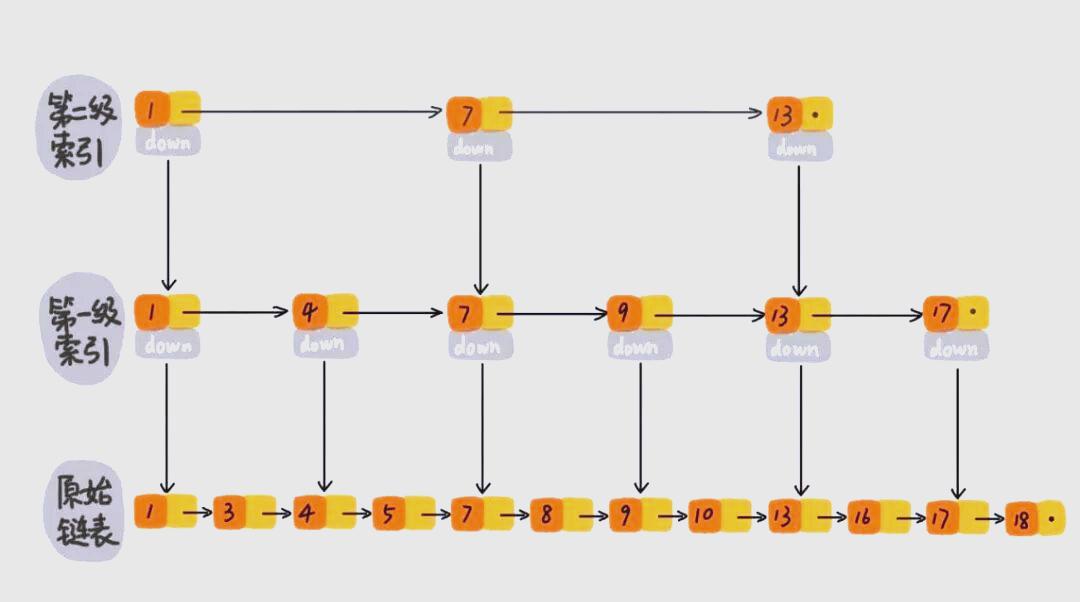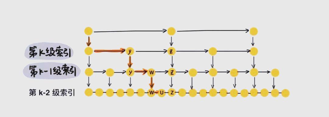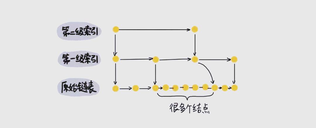 首先,我们利用索引快速定位到1、4、7、9这些关键节点。在遍历到一级索引的9时,发现其后续节点是13,这比目标元素10大,因此我们不必再继续向后查找。相反,我们通过9节点找到原始链表中的9,然后仅需向后遍历一步,即可找到我们需要的10。这样的查找路径:1、4、7、9、10,显然减少了需要遍历的元素数量,从而大大提高了查找效率。当进一步引入二级索引时,查找路径缩短为:1、7、9、10。显然,这样查找10的效率会更高。