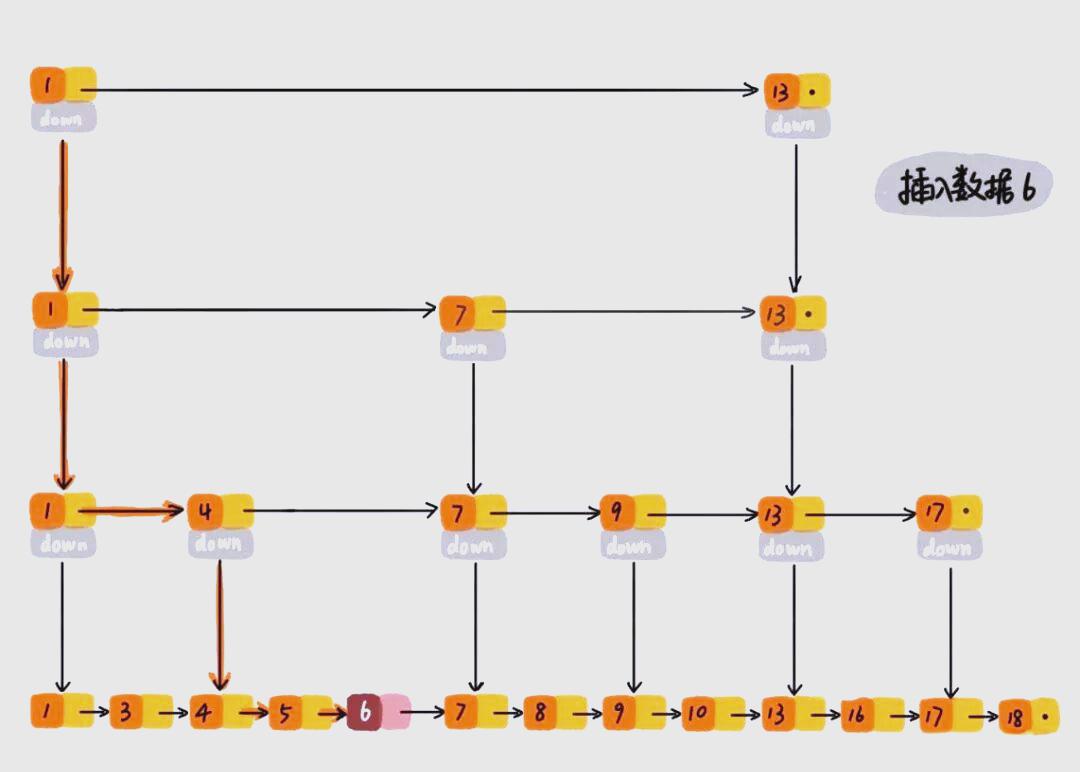 接下来,插入操作如何遵循随机索引策略以及保持索引同步的方法呢?插入新数据时,我们会仿照查找元素的路径来定位插入位置。例如,要插入数据6,整个过程类似于查找6的路径:1、1、1、4、4、5。当查找到最底层的原始链表元素5时,发现5小于6但后继节点7大于6,因此我们应将6插入到5与7之间。整个插入操作的时间复杂度与查找元素相同,为O(logn)。插入操作通过随机算法来维护多级索引的均衡,避免索引重建,以保证操作的高效性。
