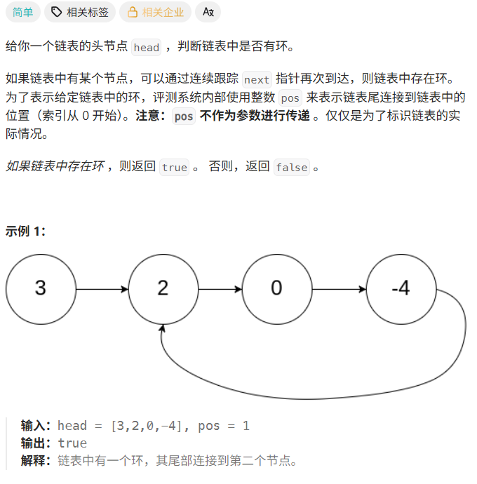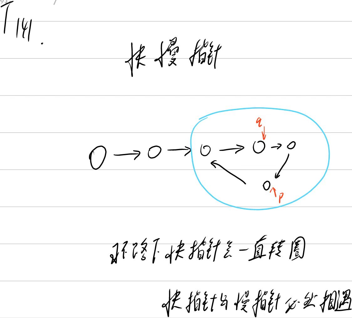 public class Solution {public boolean hasCycle(ListNode head) {ListNode p = head;ListNode q = head;while(p != null){//p为快指针,走两步p = p.next;if(p != null) //防止越界p = p.next;//快指针追上慢指针,说明有环if(p == q)return true;q = q.next;}return false;}