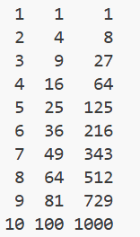 for i in range(1,11):print(str(i).rjust(2),str(i*i).rjust(3),end="");print(str(i*i*i).rjust(5));运行结果: