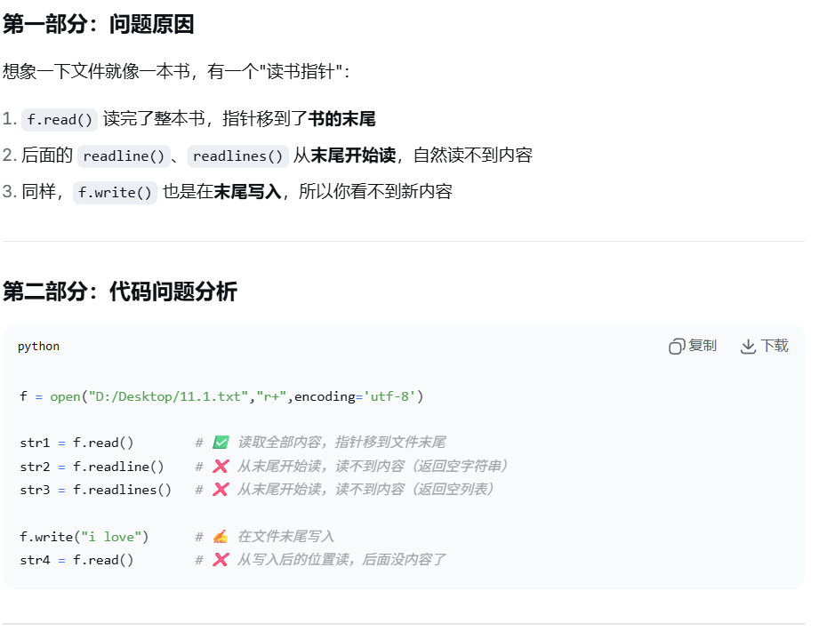文件指针在第一次 read() 后移到了末尾,后续操作都从末尾开始。