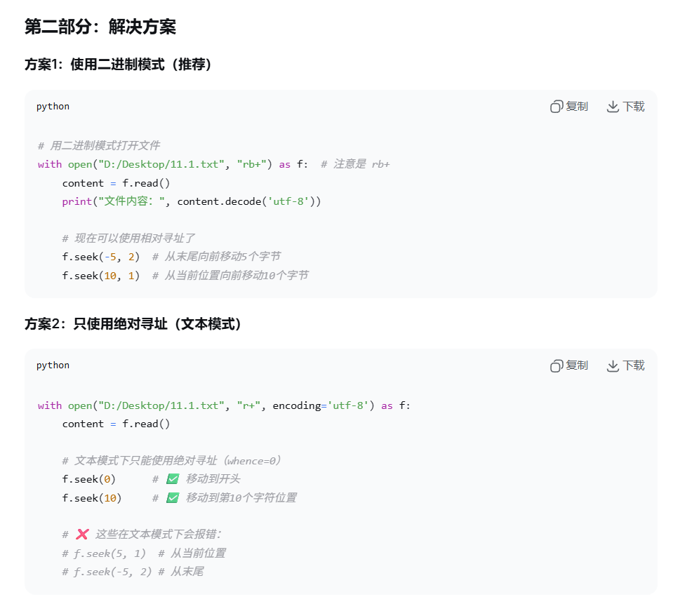 3、f.seek()使用场景问题,这个错误是因为在使用文本模式下不支持相对定位的 seek() 操作