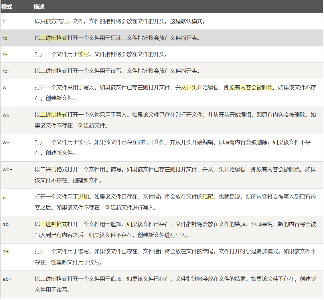 这个只有三种基本形式,只读r ,写入w,追加a,b说明是以二进制的格式展现,+说明同时允许读写。