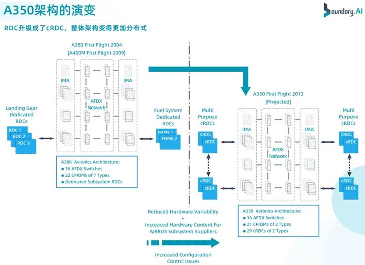 A380的航电平台在其分布式网络中引入了RDC (Remote Data Concentrator,远程数据集中器),为解决开放式IMA架构布线过多的问题,同时提升设备的通用性,降低维护难度,业界开始采用分布式的IMA架构。这样的架构有两个重大改变: