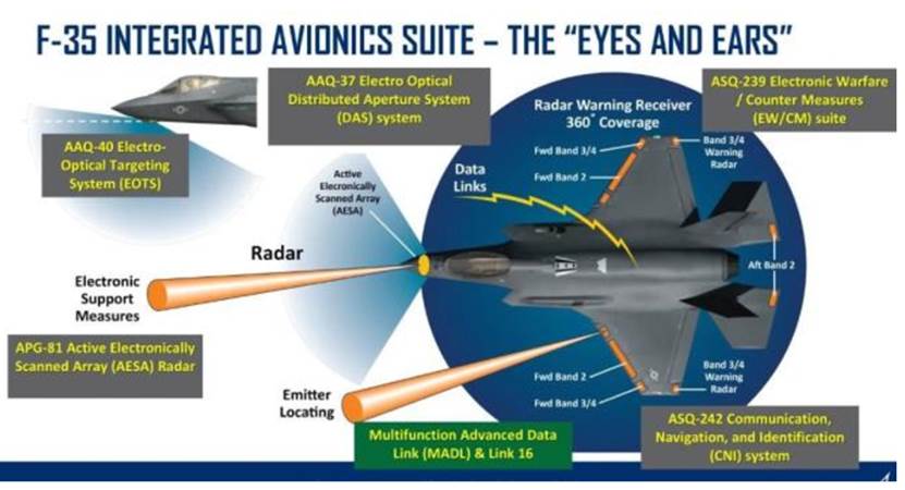 4)态势感知系统(由“多功能综合射频系统(MIRFS)”、“光电瞄准系统(EOTS)”、“光电分布式孔径系统(EODAS)”组成),等等。