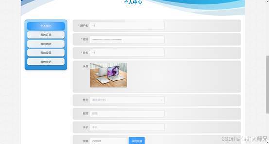 用户点击个人中心,在个人中心页面对用户名、密码、姓名、头像、性别、邮箱、手机、是否会员,进行更新信息,还可以对我的订单、我的地址、我的收藏进行详细操作,如图5-6所示。