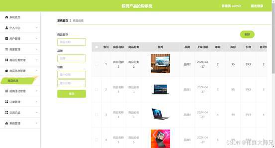 管理员点击商品信息管理,在商品信息管理页面,对商品名称、商品分类、图片、品牌、上架日期、单限、库存、价格、会员价等内容,进行查询或者删除商品信息等操作,如图5-12所示。
