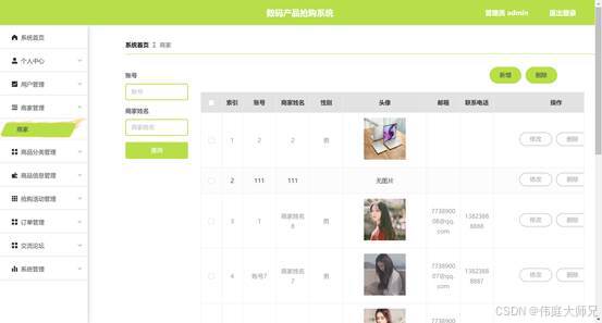 管理员点击商家管理,在商家管理页面,对账号、商家姓名、性别、头像、邮箱、联系电话等内容,进行查询或者新增、删除商家信息等操作,如图5-10所示。