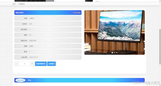 用户点击商品信息;在商品信息页面的搜索栏输入商品名称、商品分类,进行查询,然后可以查看商品名称、商品分类、图片、品牌、上架日期、单限、库存、价格、会员价等信息,如有需要可以添加到购物车、立即购买、收藏和评论等操作;如图5-4所示。