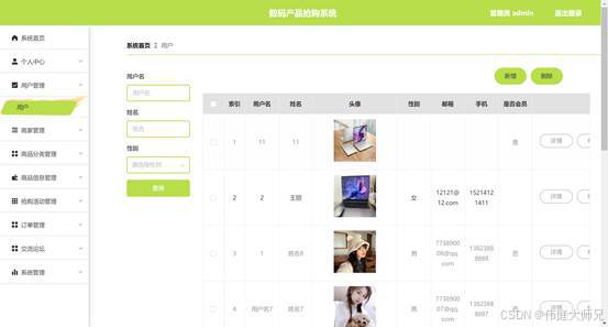 管理员点击用户管理,在用户管理页面,对用户名、姓名、头像、性别、邮箱、手机、是否会员等内容,进行查询或者新增、删除用户信息等操作,如图5-9所示。