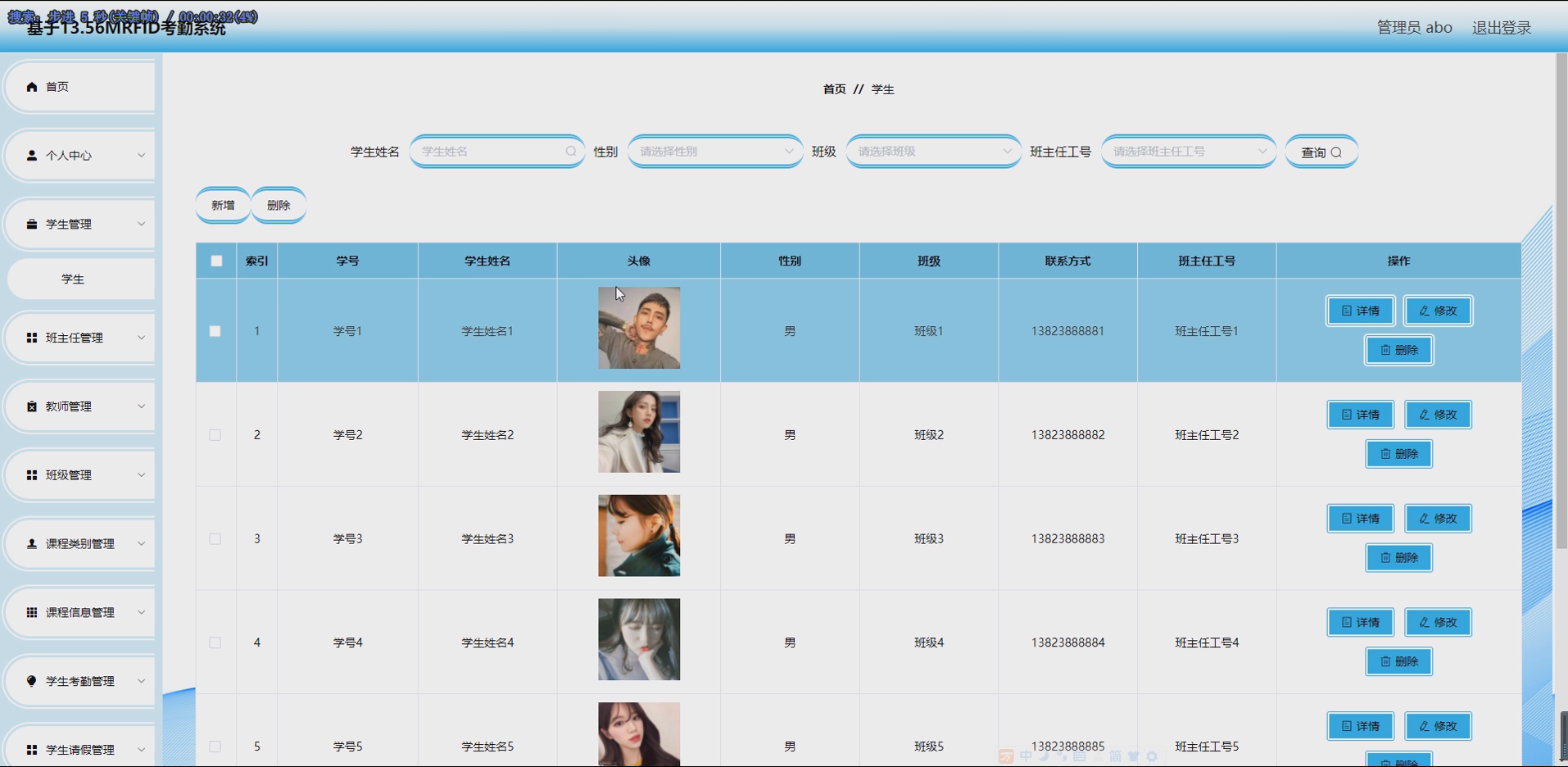 系统项目功能有:学生,班主任,教师,班级,课程类别,课程信息,学生考勤,学生请假