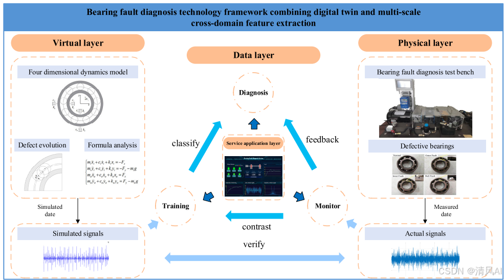 轴承是工业生产、交通运输和航空航天等领域的关键部件,但其在运行中易因负载、制造工艺等因素发生故障,导致设备停机。传统数据驱动方法虽有效,但面临样本不足、标签缺失等挑战。数字孪生技术能生成高保真仿真数据,弥补数据短缺,而多尺度特征提取可提升特征捕获能力。本文通过结合两者,实现高精度故障诊断。