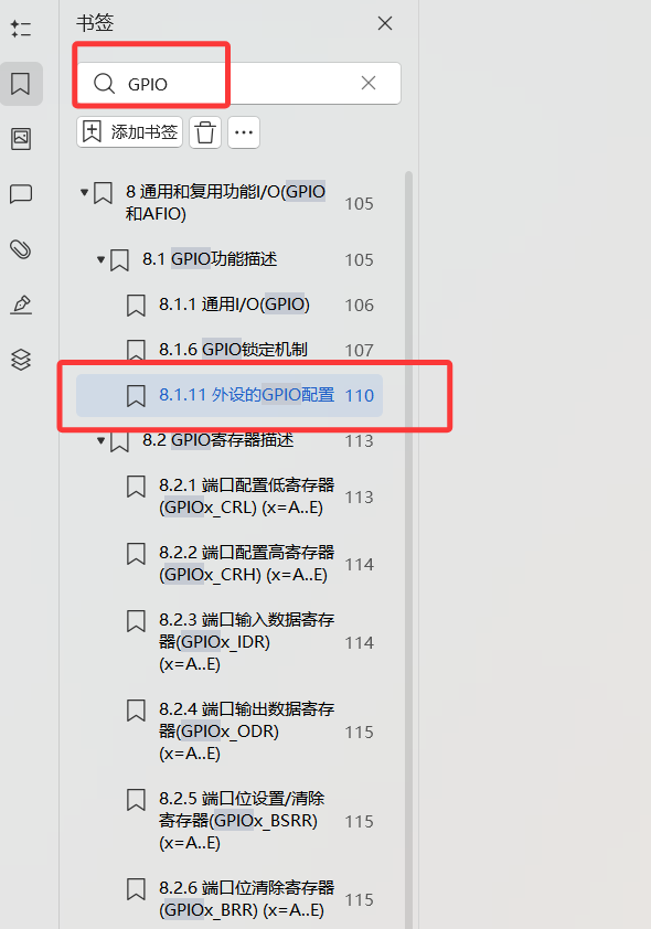 打开芯片手册,在搜索框中输入GPIO,找到外设的GPIO配置这一选项