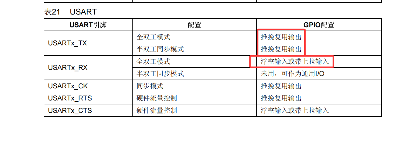 这里面有着各种各样外设的引脚应该如何配置的答案,通过浏览这一页,我们就能够得到我们想要的答案,这里面串口1的输出是复用推挽,输入可以是输入上拉或者输入浮空两种模式选择