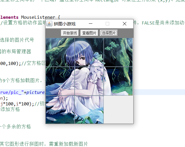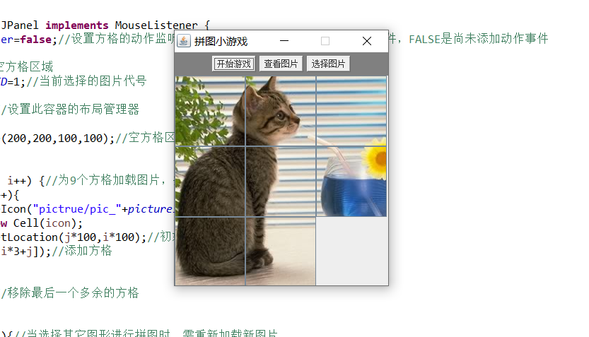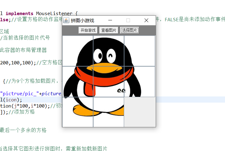 拼图游戏是广受欢迎的一种智力游戏,它的变化多端,难度不一,让人百玩不厌。拼图游戏是把一张图片分成多个小块,根据难度一般有9块(3×3)、16块(4×4)、25块(5×5)等,然后随机打乱图块的顺序,重新把拼图还原成原来的样子。这次我做的这个拼图小游戏就是一个简单的3×3小拼图,可以实现一般的拼图功能,并且可以选择不同的图片。操作也是非常简单,鼠标点击“开始游戏”进行游戏,然后用鼠标点击拼图块完成拼图就可以了。