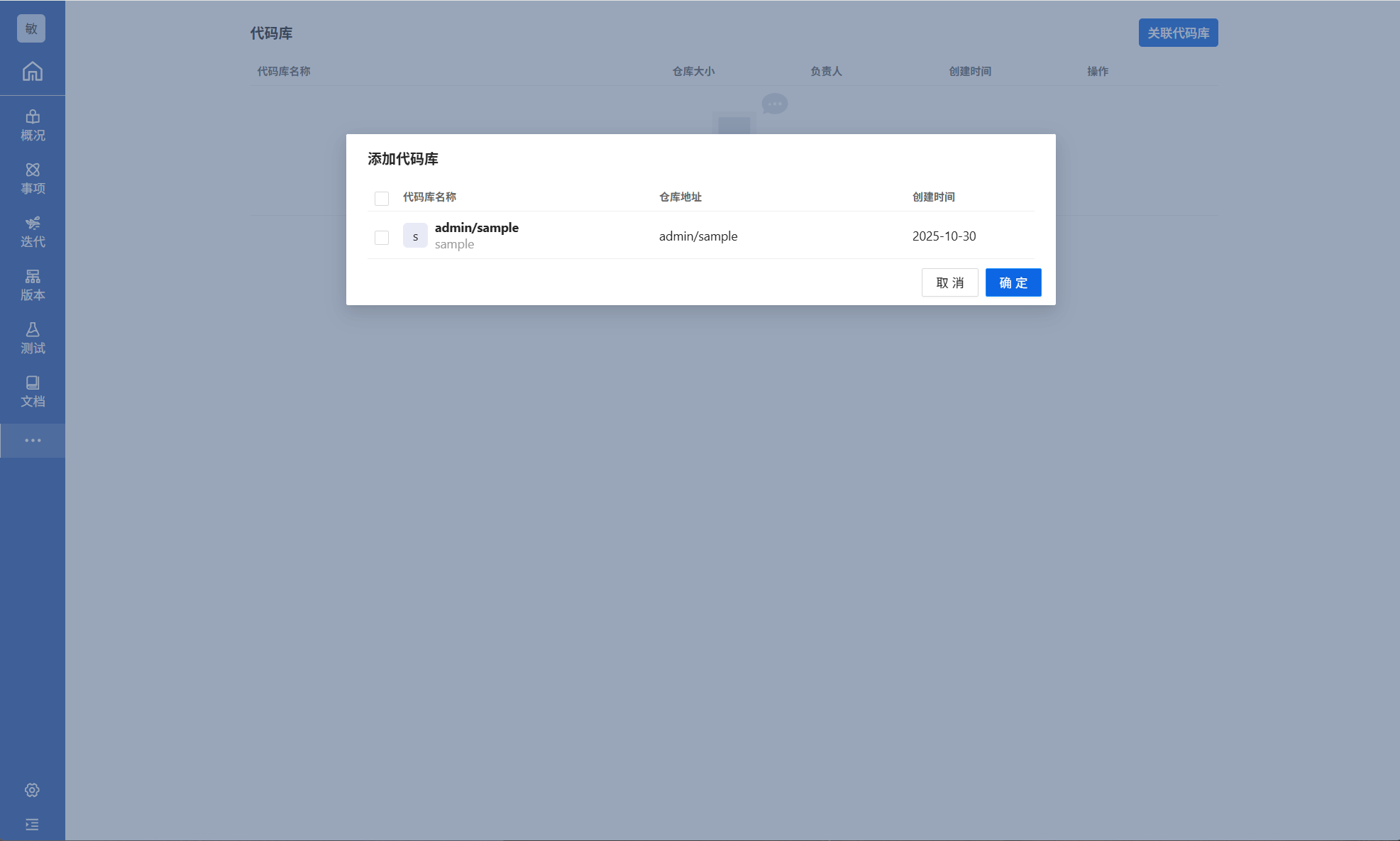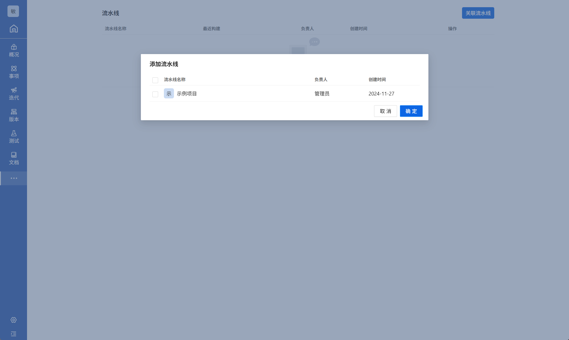进入具体项目,点击左侧导航栏中的更多按钮,选择流水线->关联流水线。选择需要的流水线后确定,即可关联成功