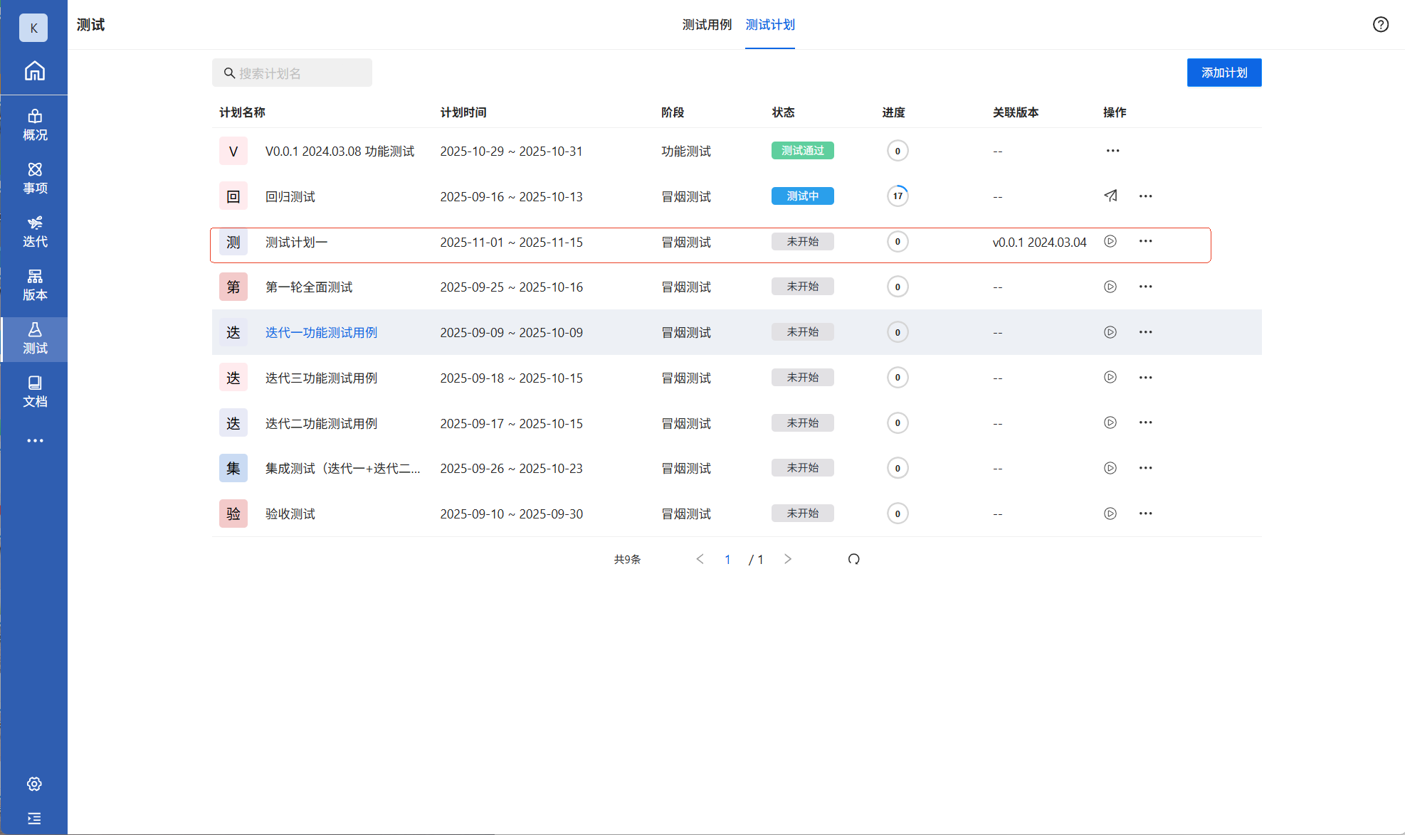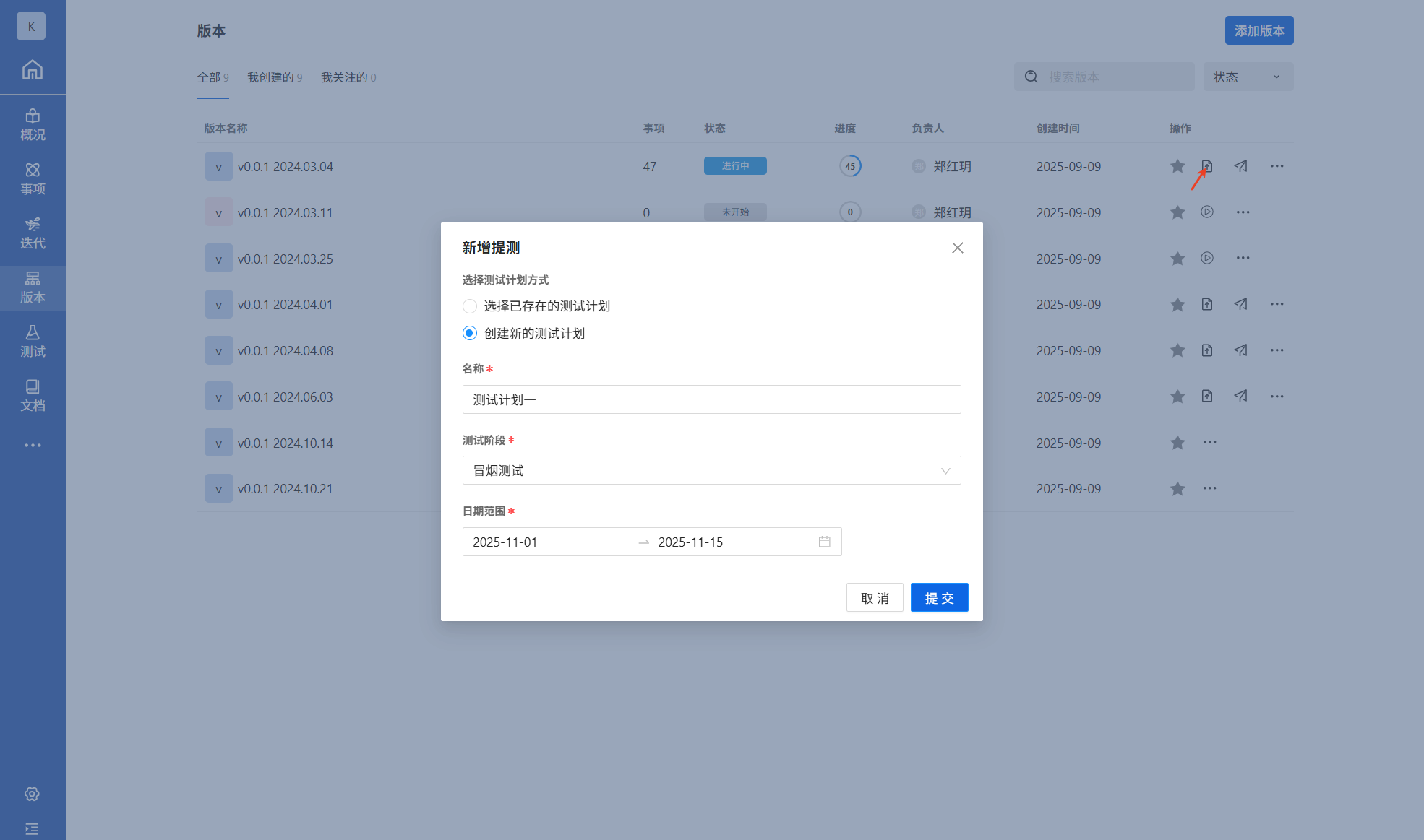 当所有事项全部处理完成后,开发人员可以点击对应版本后方的提测按钮并生成一个此版本的测试计划。