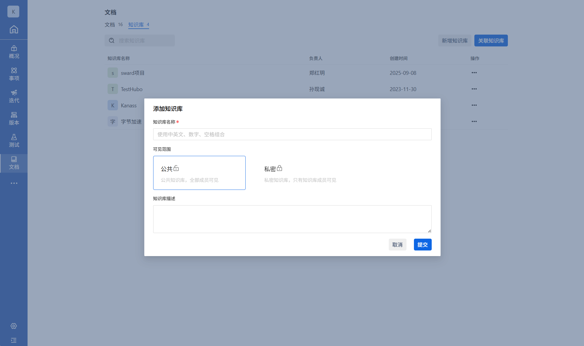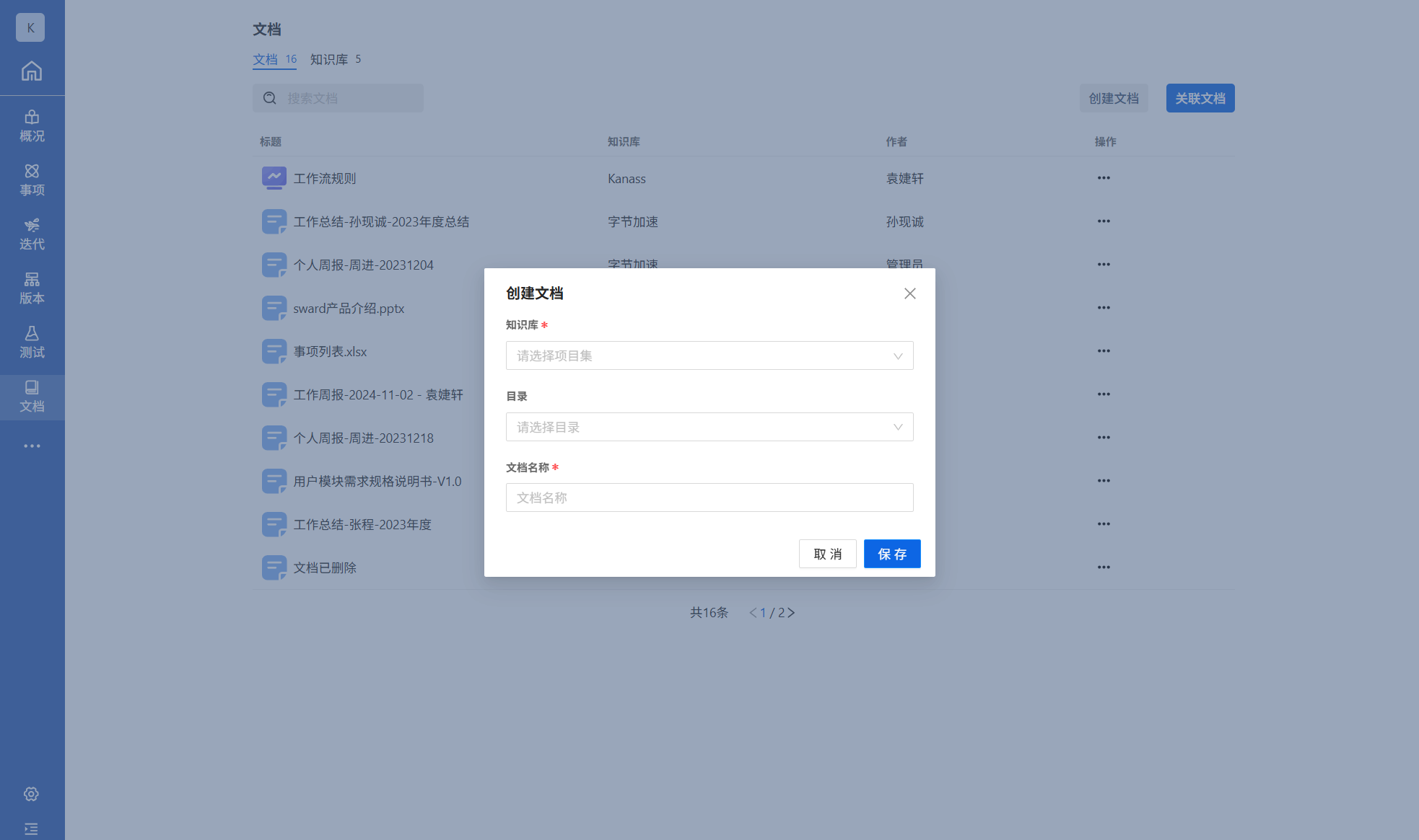 进入kanass项目->文档->知识库,可以为当前项目添加并直接关联一个知识库。知识库添加成功后,点击知识库名称,即可打开sward页面,可以在sward中创建或上传文档。