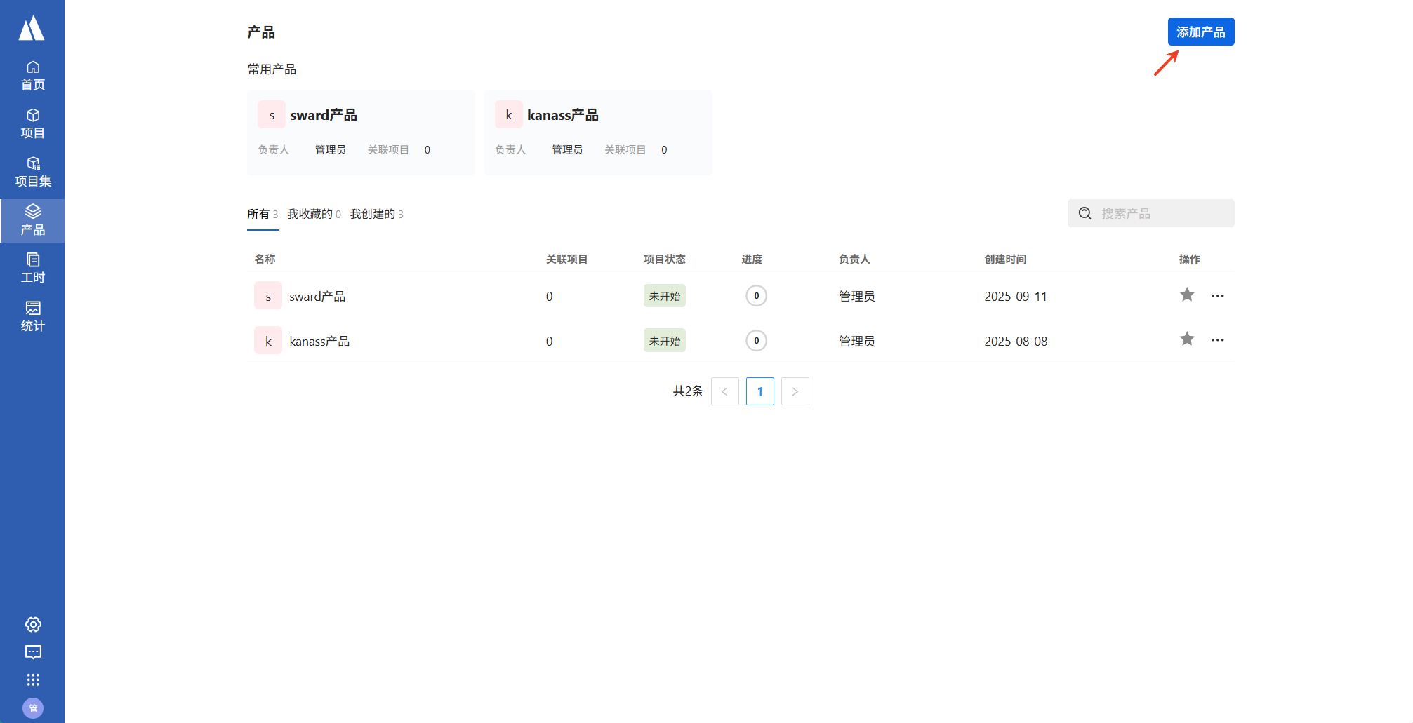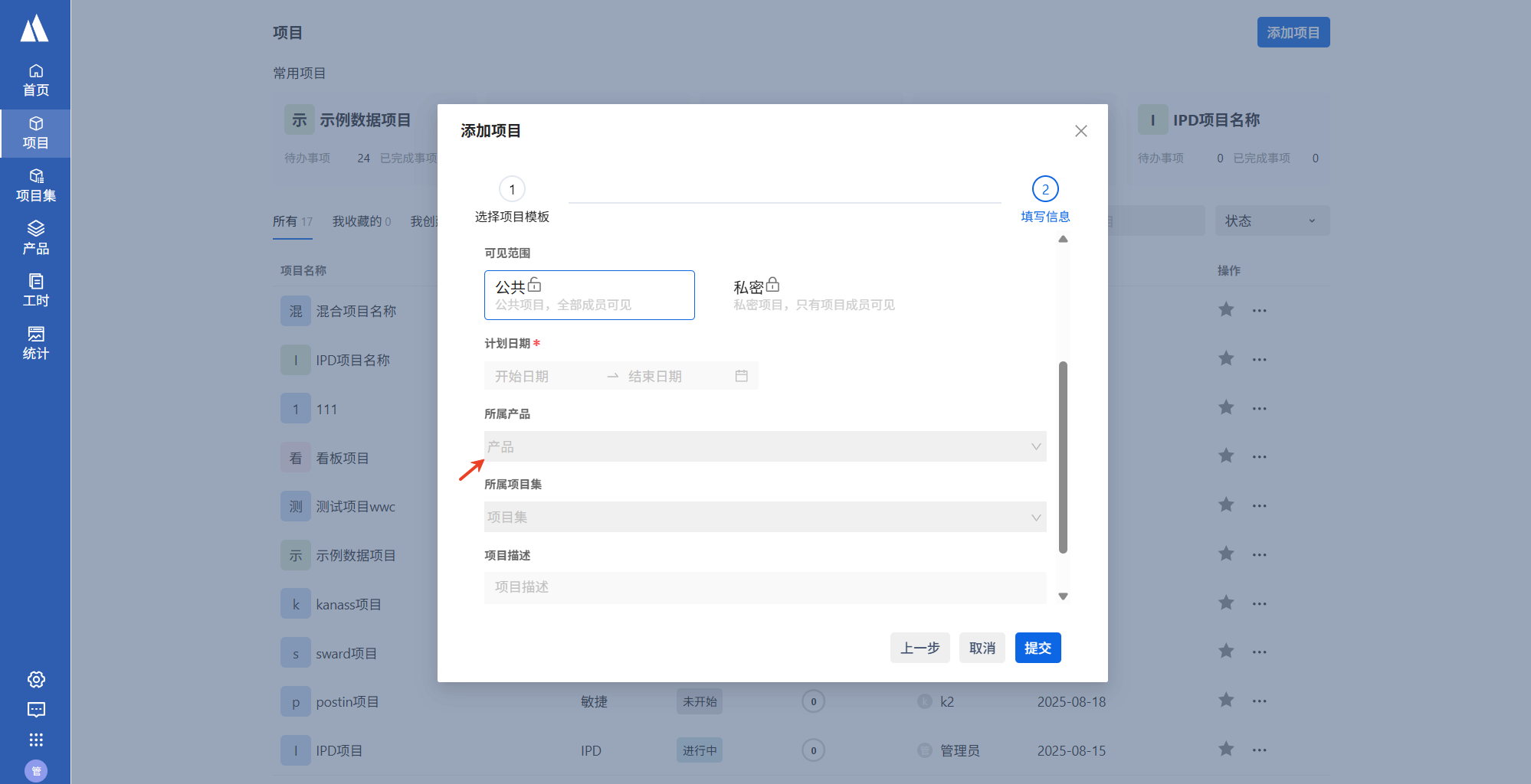 在产品中可以创建项目,且创建的项目会自动关联当前产品。