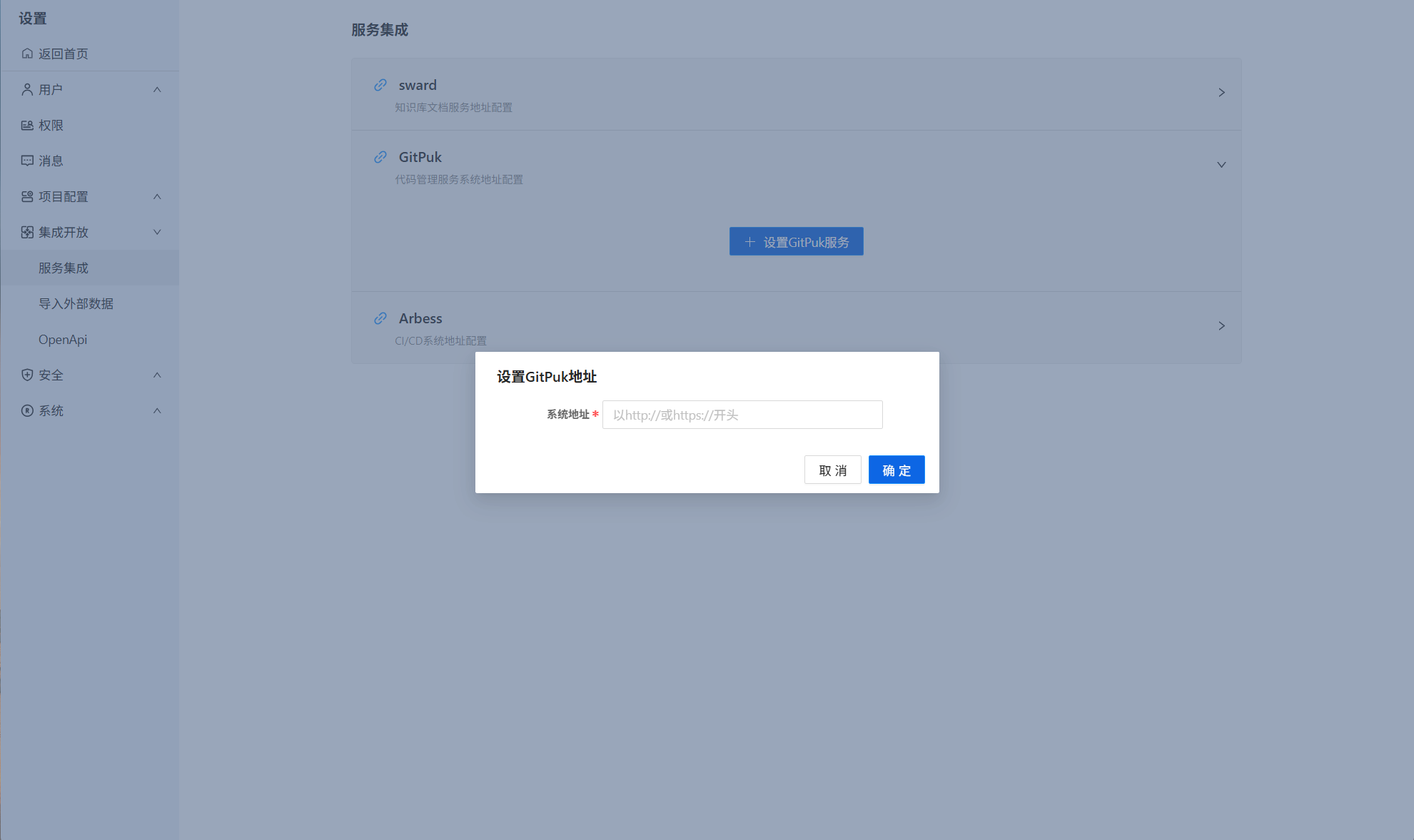 先进入系统设置->集成开放->服务集成,添加GikPuk地址。