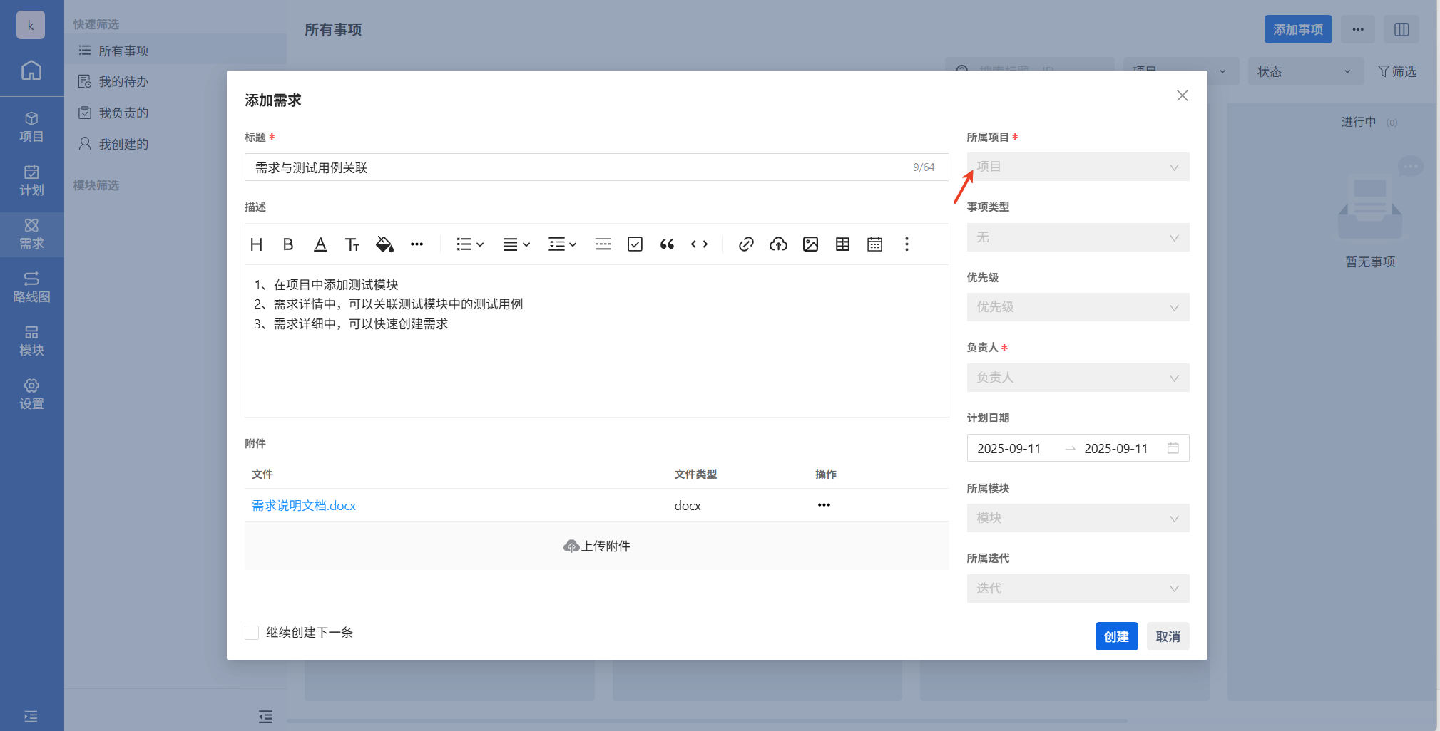 产品经理可以在产品的需求管理中录入和管理需求,录入需求时可以为需求选择具体项目。