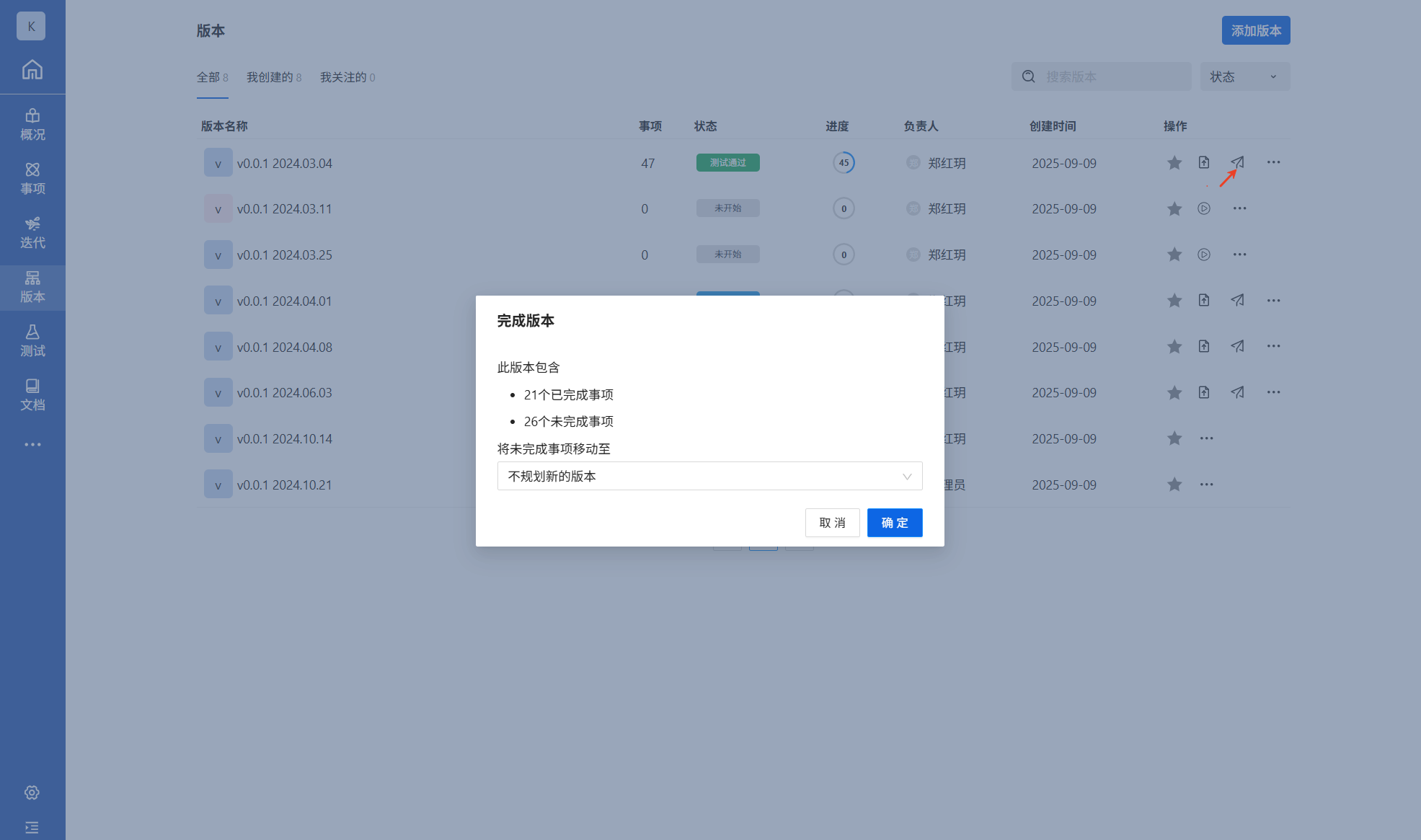 创建版本后,版本状态为未开始。当技术人员开始修复或完成版本中事项时,版本的状态可以设置为进行中。