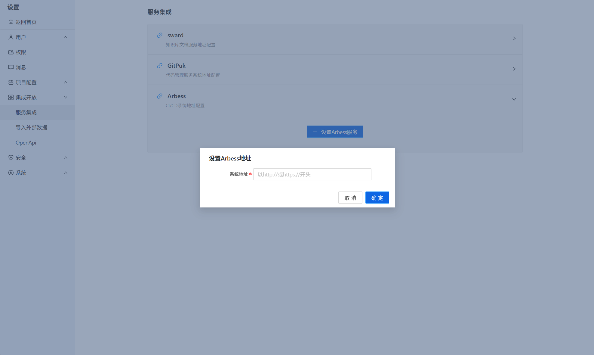 进入系统设置->集成开放->服务集成,添加Arbess地址