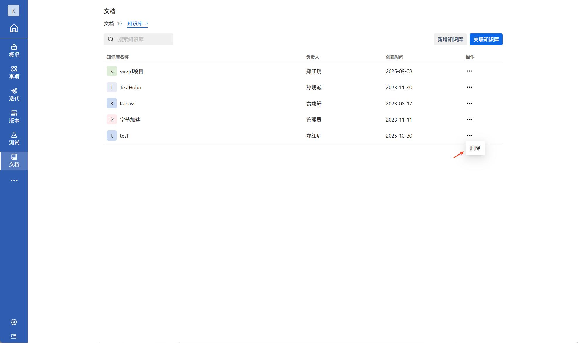 在知识库页面,点击列表中的更多按钮,可以删除知识库。注:若知识库是在sward中创建,并关联到kanass,此处删除的是关联关系。若知识库是在kanass中直接创建,则此处删除为删除知识库。