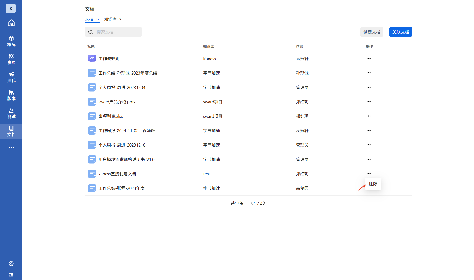 在文档页面,点击列表中的更多按钮,可以删除文档。注:若文档是在sward中创建,并关联到kanass,此处删除的是关联关系。若文档是在kanass中直接创建,则此处删除为删除文档。