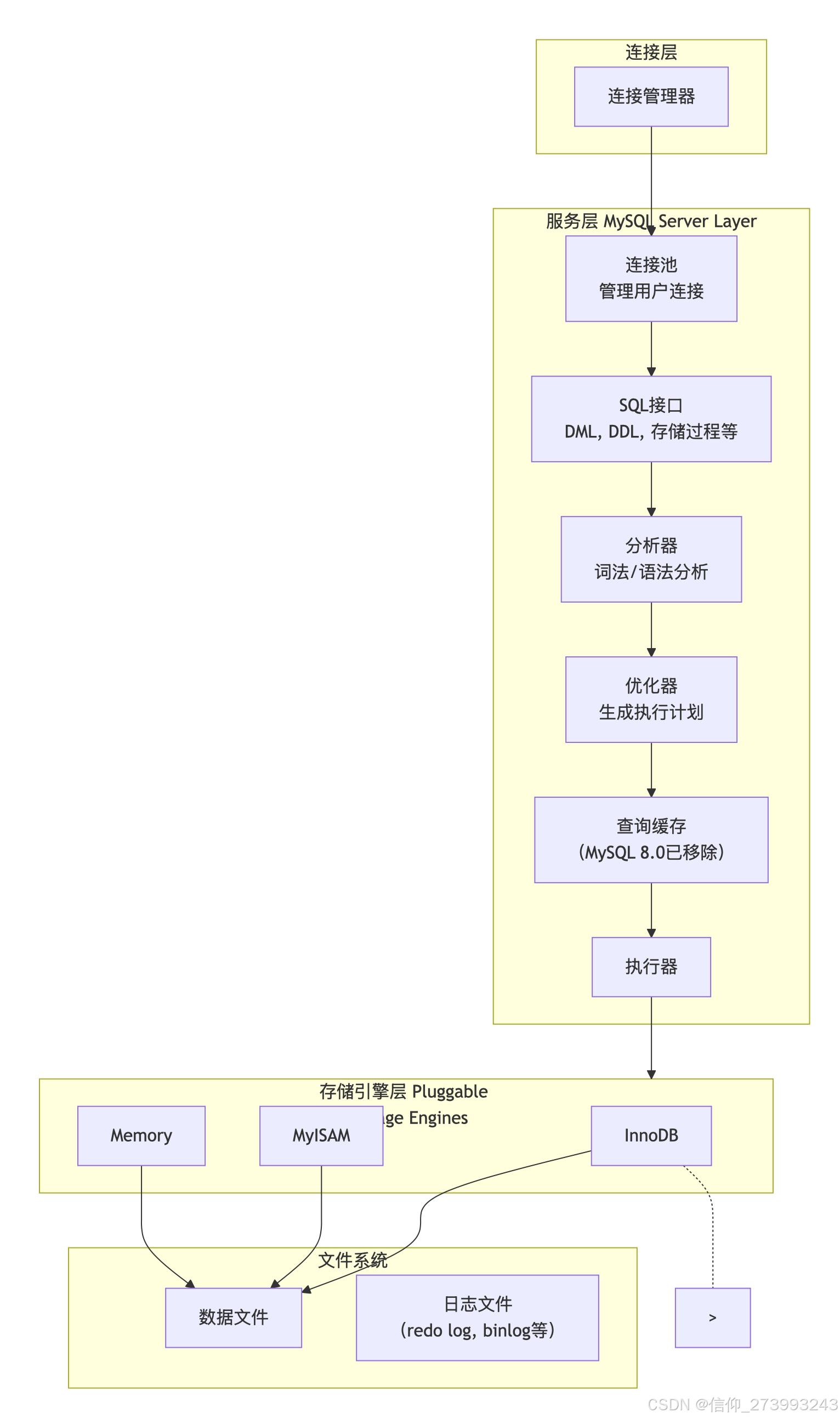 这个三层架构,特别是服务层与存储引擎层分离的设计,是MySQL具有高度灵活性和可扩展性的关键原因。我们之前讨论的binlog属于服务层,而 redo log则属于InnoDB存储引擎层,正是这个架构的完美体现。