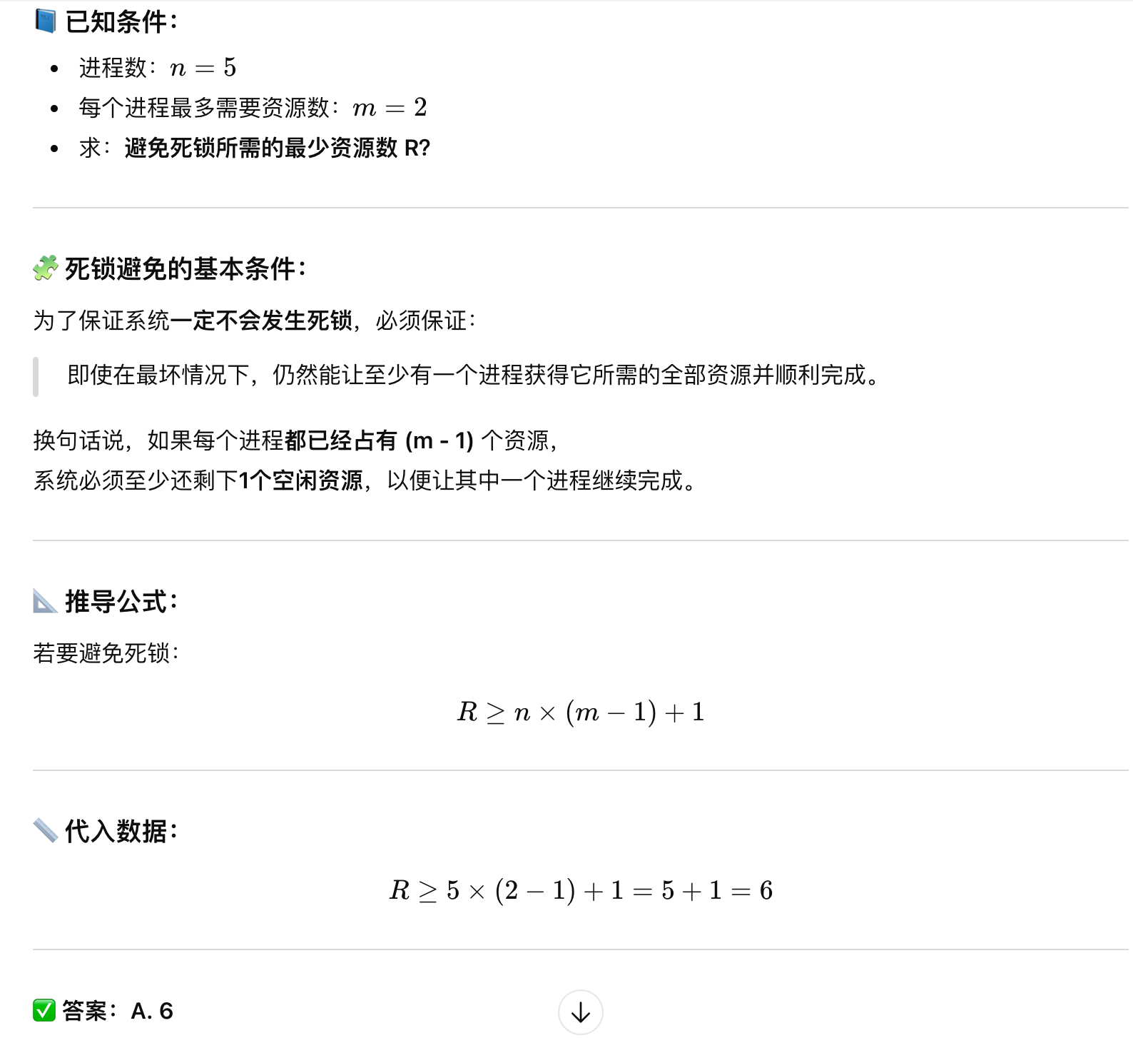 1.7. 操作系统中有5个进程,若每个进程最多可同时访问2个资源,为了不发生死锁,至少需要提供(A)个资源。