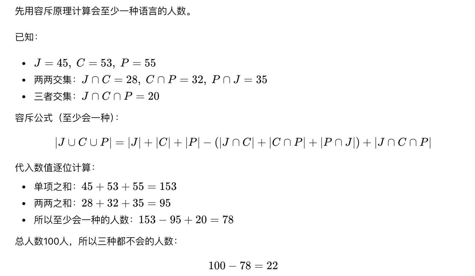 1.9. 某公司有100人,其中会Java语言的有45人,会C语言的有53人,会Python语言的有55人,既会Java语言也会C语言的有28人,既会C语言也会Python语言的有32人,既会Python语言也会Java语言的有35人,三种语言都会的有20,那么三种语言都不会的有()人。