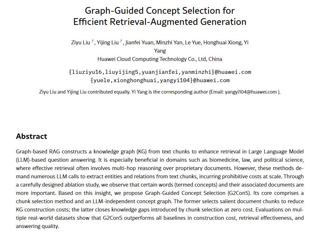华为云研究团队提出G2ConS框架,通过图引导概念选择技术大幅降低图基于检索增强生成(GraphRAG)的构建成本,在多个数据集上实现31.44%的性能提升,同时将成本降低80%。