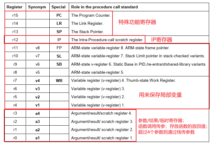 (1)在arm中有个ATPCS规则:ARM-THUMB procedure call standard(ARM-Thumb过程调用标准)。 约定r0-r15寄存器的用途: