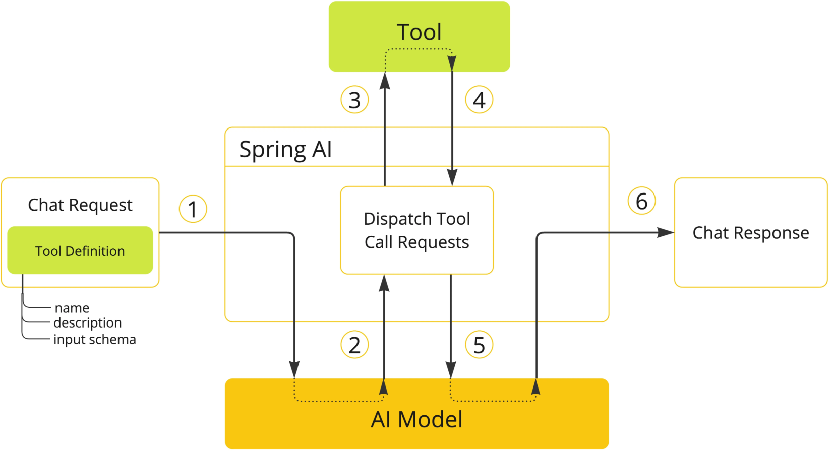 2>工具调用请求:Spring AI自动处理与AI模型的通信并解析工具调用请求,并且支持多个工具链式调用。
