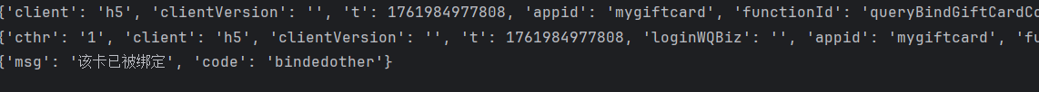 if data['code'] == 0:st = data['st']vt = data['vt']cp1 = execjs.compile(open('h5st.js','r',encoding='utf-8').read())result = cp1.call('verifyCard',..........)print(result)url = "/api"params = {"functionId": "queryBindGiftCardComApp"}..............print(data)response = session.post(url, headers=headers, data=data)print(response.json())