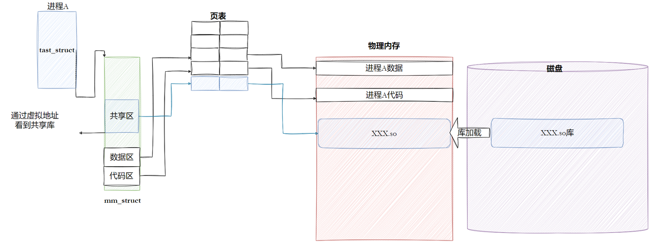 有需要的时候把库加载到物理内存,通过页表映射到进程地址空间的共享区即可。