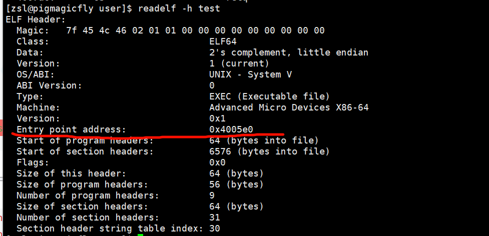 //查看目标文件 $ readelf -h hello.o ELF Header:Magic: 7f 45 4c 46 02 01 01 00 00 00 00 00 00 00 00 00 # ELF文件标识符(魔数)Class: ELF64 # 文件类别:64位架构Data: 2's complement, little endian # 数据编码:小端序二进制补码Version: 1 (current) # ELF版本:当前版本(1)OS/ABI: UNIX - System V # 操作系统ABI:System V UNIXABI Version: 0 # ABI扩展版本:未扩展Type: REL (Relocatable file) # 文件类型:可重定位文件(目标文件)Machine: Advanced Micro Devices X86-64 # 目标平台:x86-64架构Version: 0x1 # 对象文件版本:1Entry point address: 0x0 # 入口点地址:无(目标文件为0)Start of program headers: 0 (bytes into file) # 程序头表起始偏移:无(目标文件为0)Start of section headers: 728 (bytes into file) # 节头表起始偏移:728字节处Flags: 0x0 # 处理器特定标志:无标志(0)Size of this header: 64 (bytes) # ELF头大小:64字节Size of program headers: 0 (bytes) # 程序头表条目大小:无(目标文件为0)Number of program headers: 0 # 程序头表条目数:无(目标文件为0)Size of section headers: 64 (bytes) # 节头表条目大小:64字节Number of section headers: 13 # 节头表条目数:13个Section header string table index: 12 # 节头字符串表索引:第12节(.shstrtab)//查看可执行程序 $ gcc *.o $ readelf -h a.out ELF Header:Magic: 7f 45 4c 46 02 01 01 00 00 00 00 00 00 00 00 00 # ELF文件标识符(魔数)Class: ELF64 # 文件类别:64位架构Data: 2's complement, little endian # 数据编码:小端序二进制补码Version: 1 (current) # ELF版本:当前版本(1)OS/ABI: UNIX - System V # 操作系统ABI:System V UNIXABI Version: 0 # ABI版本:0Type: DYN (Shared object file) # 文件类型:动态共享对象文件(so)Machine: Advanced Micro Devices X86-64 # 目标平台:x86-64架构Version: 0x1 # 对象文件版本:1Entry point address: 0x1060 # 入口点地址:0x1060(动态链接后解析)Start of program headers: 64 (bytes into file) # 程序头表起始偏移:64字节处Start of section headers: 14712 (bytes into file) # 节头表起始偏移:14712字节处Flags: 0x0 # 处理器特定标志:无Size of this header: 64 (bytes) # ELF头大小:64字节Size of program headers: 56 (bytes) # 程序头表条目大小:56字节Number of program headers: 13 # 程序头表条目数:13个Size of section headers: 64 (bytes) # 节头表条目大小:64字节Number of section headers: 31 # 节头表条目数:31个Section header string table index: 30 # 节头字符串表索引:第30节(.shstrtab)上面仅供了解,只需要知道其作用,也就是主要目的是定位文件的其他部分即可。