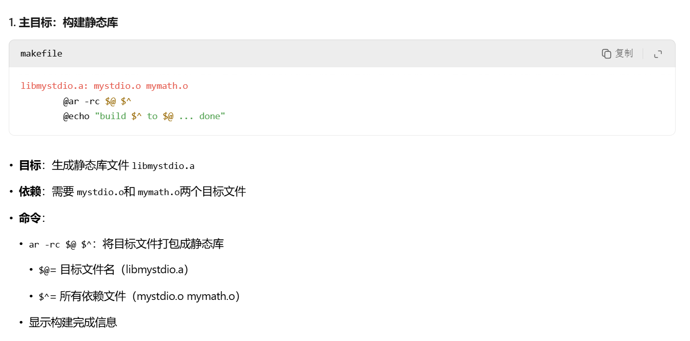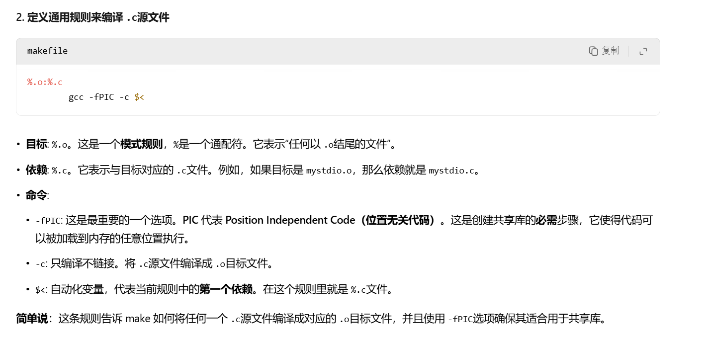 // 场景1:头文件和库文件安装到系统路径下(比如lib64目录下找,就是path里的)gcc main.c -lmystdio// 场景2:头文件和库文件和我们自己的源文件在同一个路径下gcc main.c -L. -lmymath// 场景3:头文件和库文件有自己的独立路径gcc main.c -I头文件路径 -L库文件路径 -lmymath-L:指定库路径