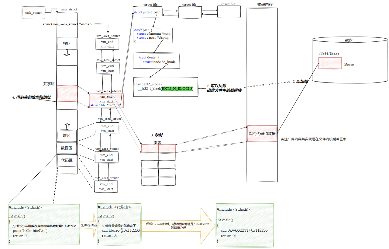 让我们的进程找到动态库的本质:也是文件操作,不过我们访问库函数,通过虚拟地址进行跳转访问的,所以需要把动态库映射到进程的地址空间中。