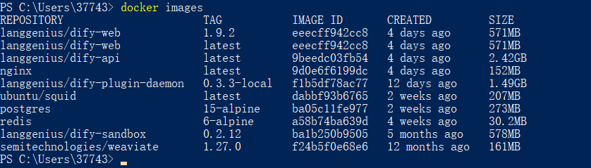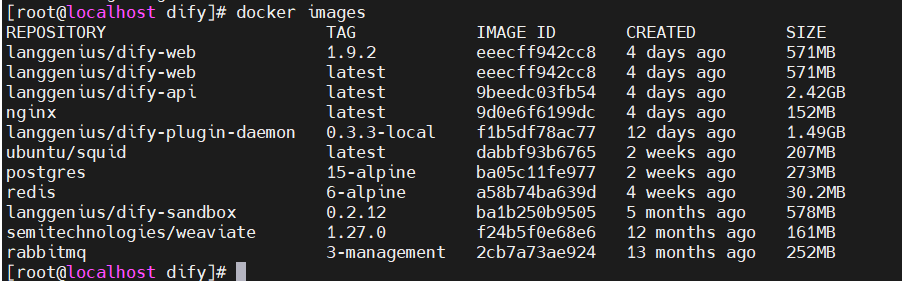 docker save -o D:\dify_images.tar `postgres:15-alpine `redis:6-alpine `langgenius/dify-sandbox:0.2.12 `langgenius/dify-plugin-daemon:0.3.3-local `ubuntu/squid:latest `semitechnologies/weaviate:1.27.0 `langgenius/dify-api:latest `langgenius/dify-web:1.9.2 `nginx:latest