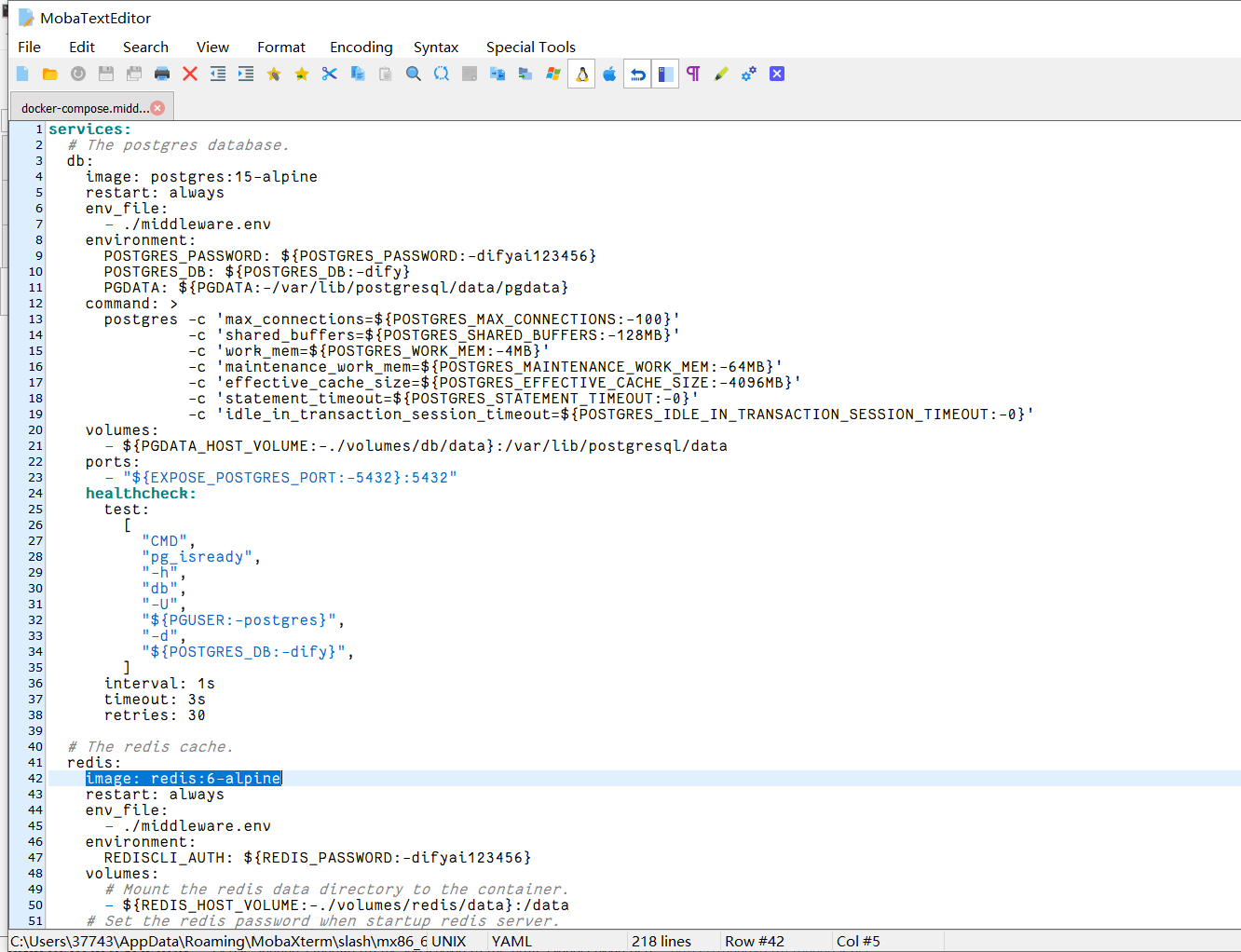 该文件定义了部署 Dify 所需的所有服务(如 API 服务、数据库、Redis 等)、镜像版本、端口映射、数据卷等配置。