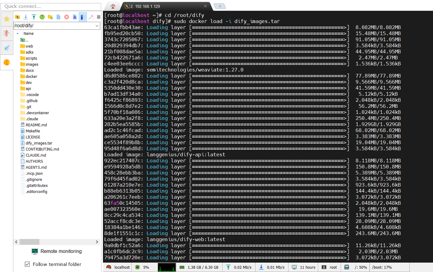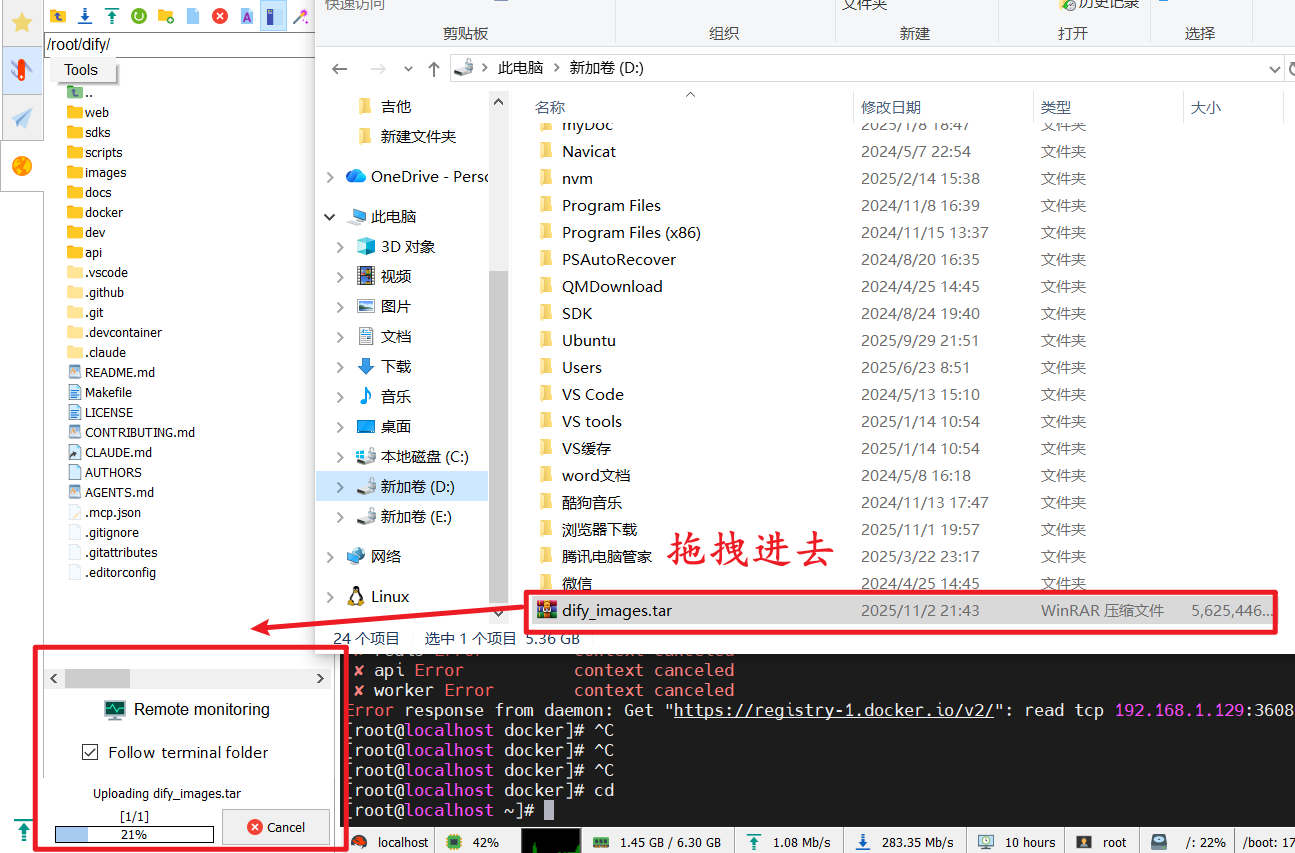 将dify_images.tar 文件拖拽到 Linux 的/root/dify/目录下: