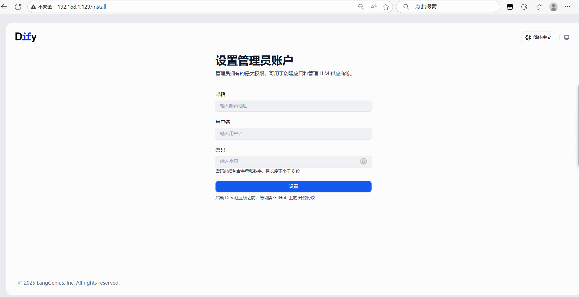 设置管理员账户和密码,进行登录