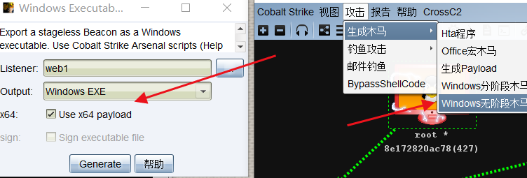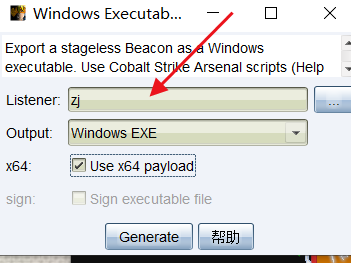 然后生成无阶段木马(分阶段木马无法选择中转监听器)
