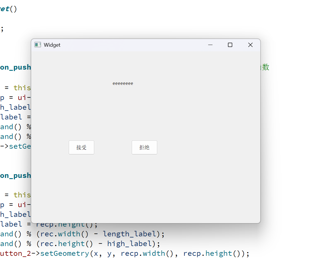 {QRect rec = this->geometry();QRect recp = ui->pushButton_2->geometry();int length_label = recp.width();int high_label = recp.height();int x = rand() % (rec.width() - length_label);int y = rand() % (rec.height() - high_label);ui->pushButton_2->setGeometry(x, y, recp.width(), recp.height());