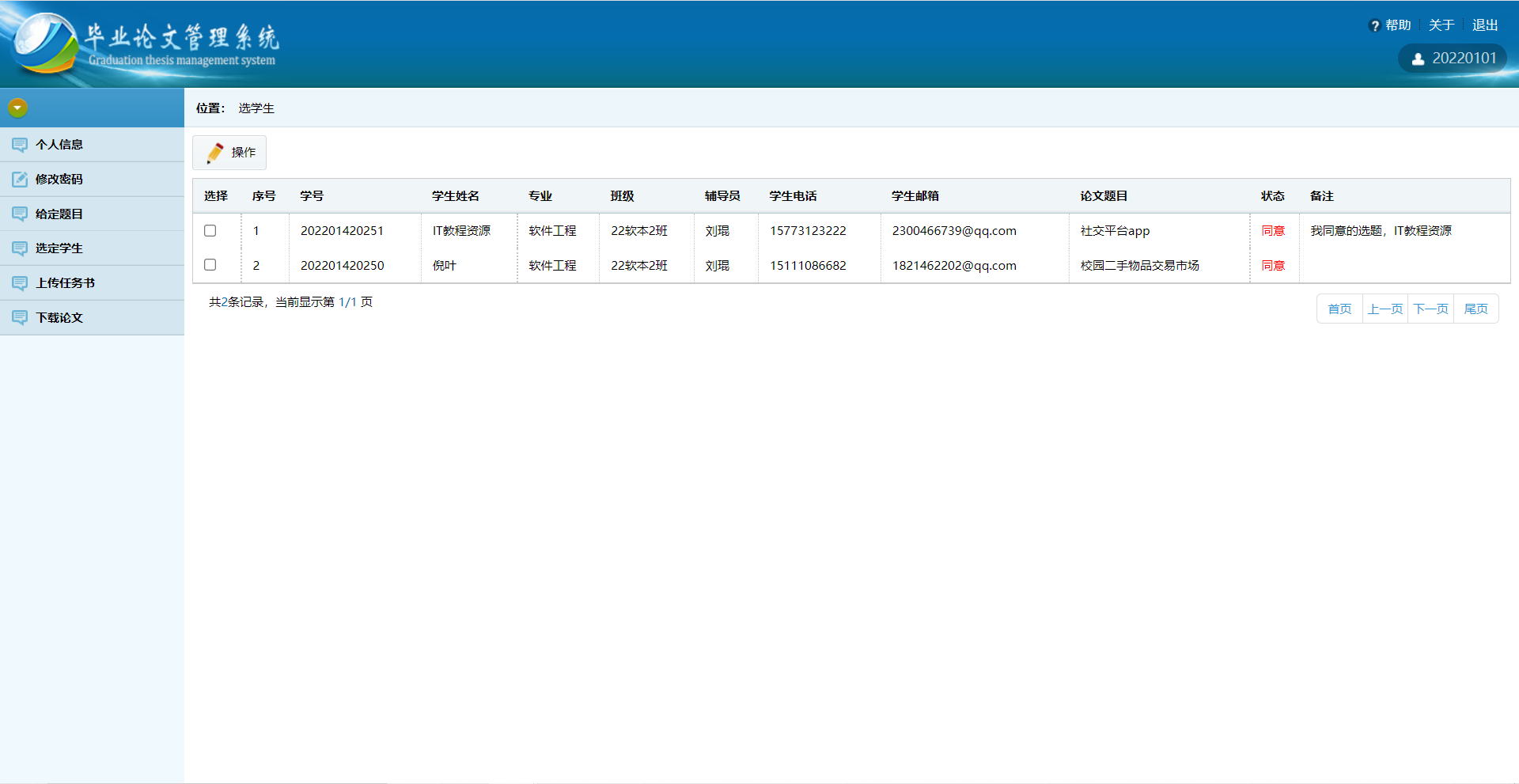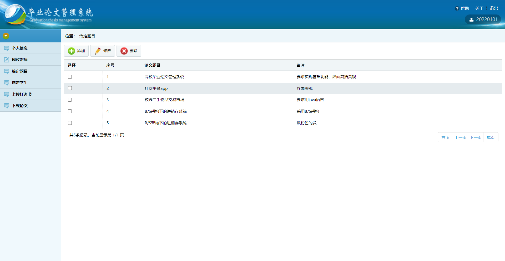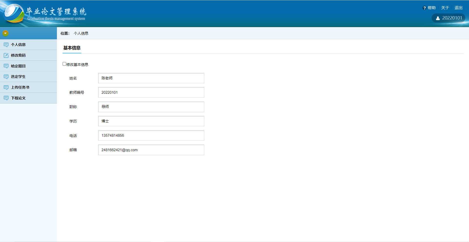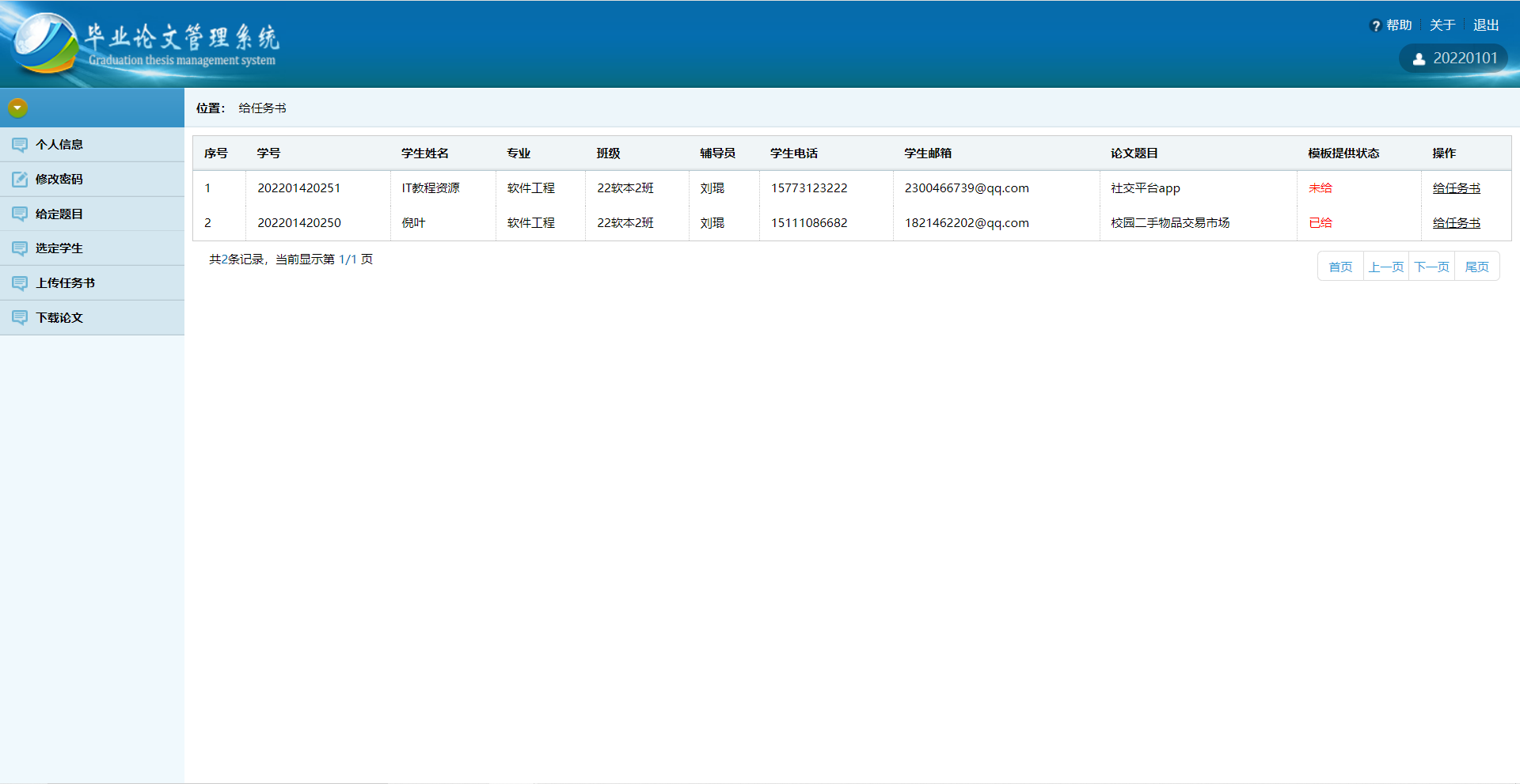 教师模块:登陆、个人信息、修改密码、给定题目、选择学生、给任务书、下载论文