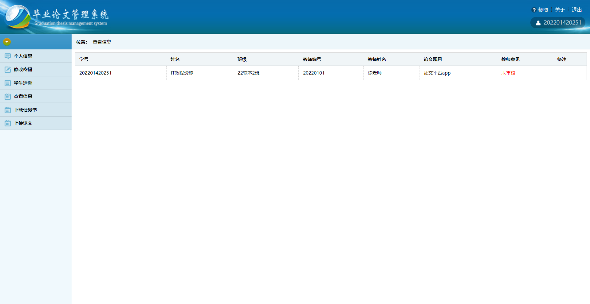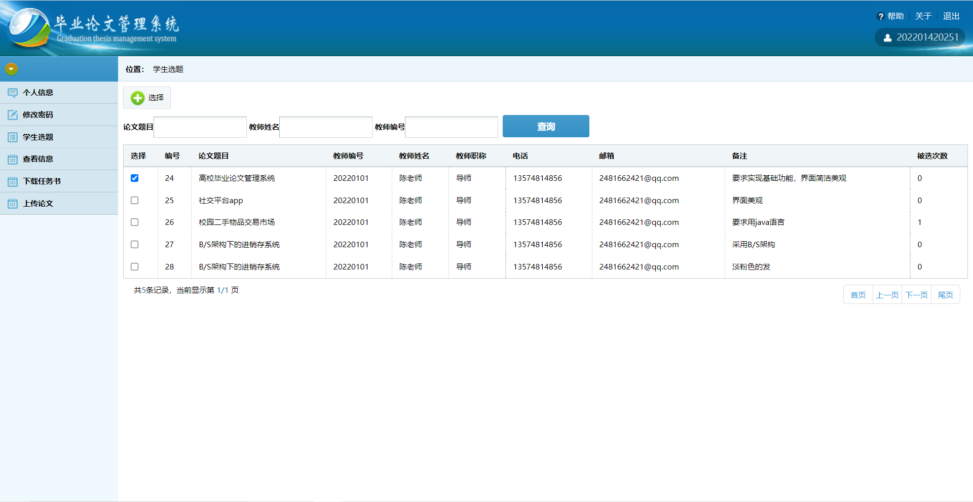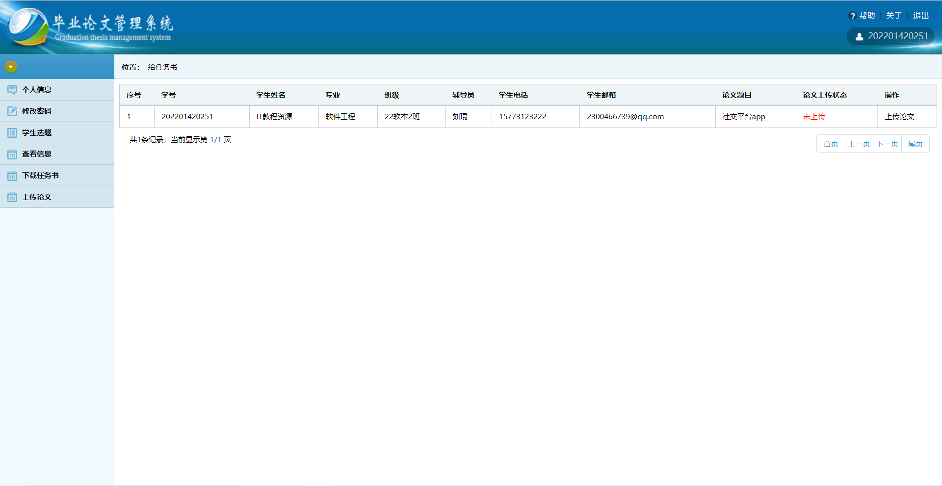 学生模块:登陆、个人信息、学生选题、查看信息、选择学生、下载任务书、上传论文