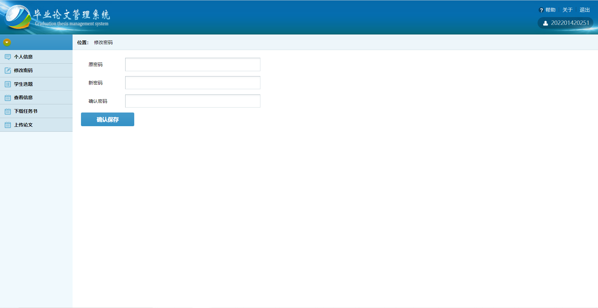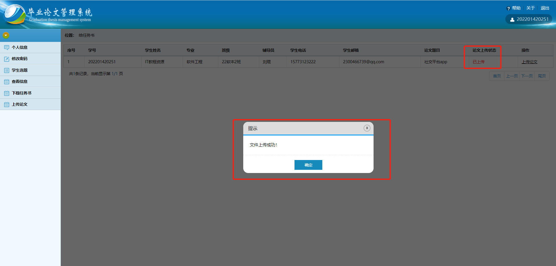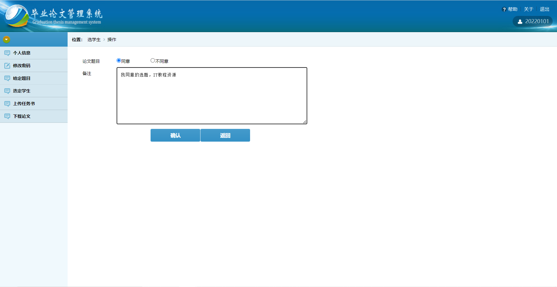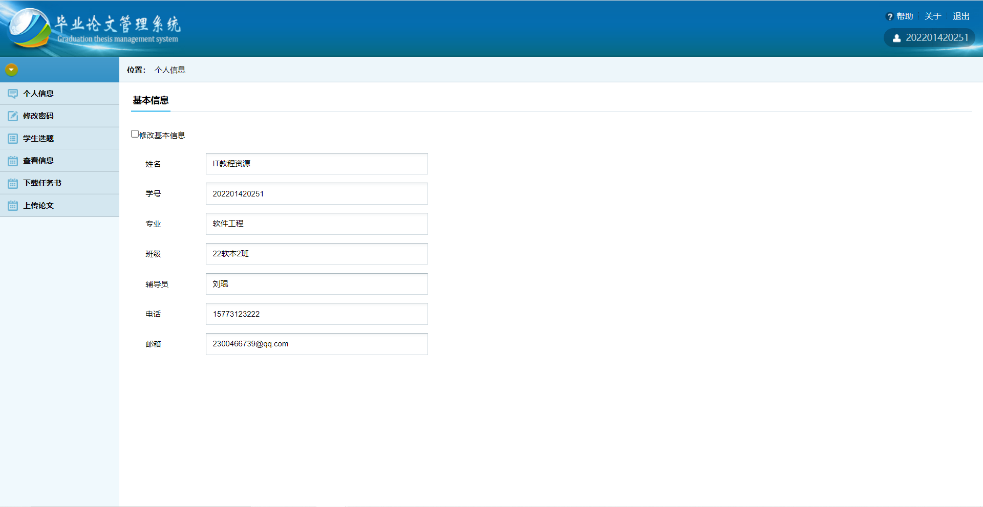 学生模块:登陆、个人信息、学生选题、查看信息、选择学生、下载任务书、上传论文