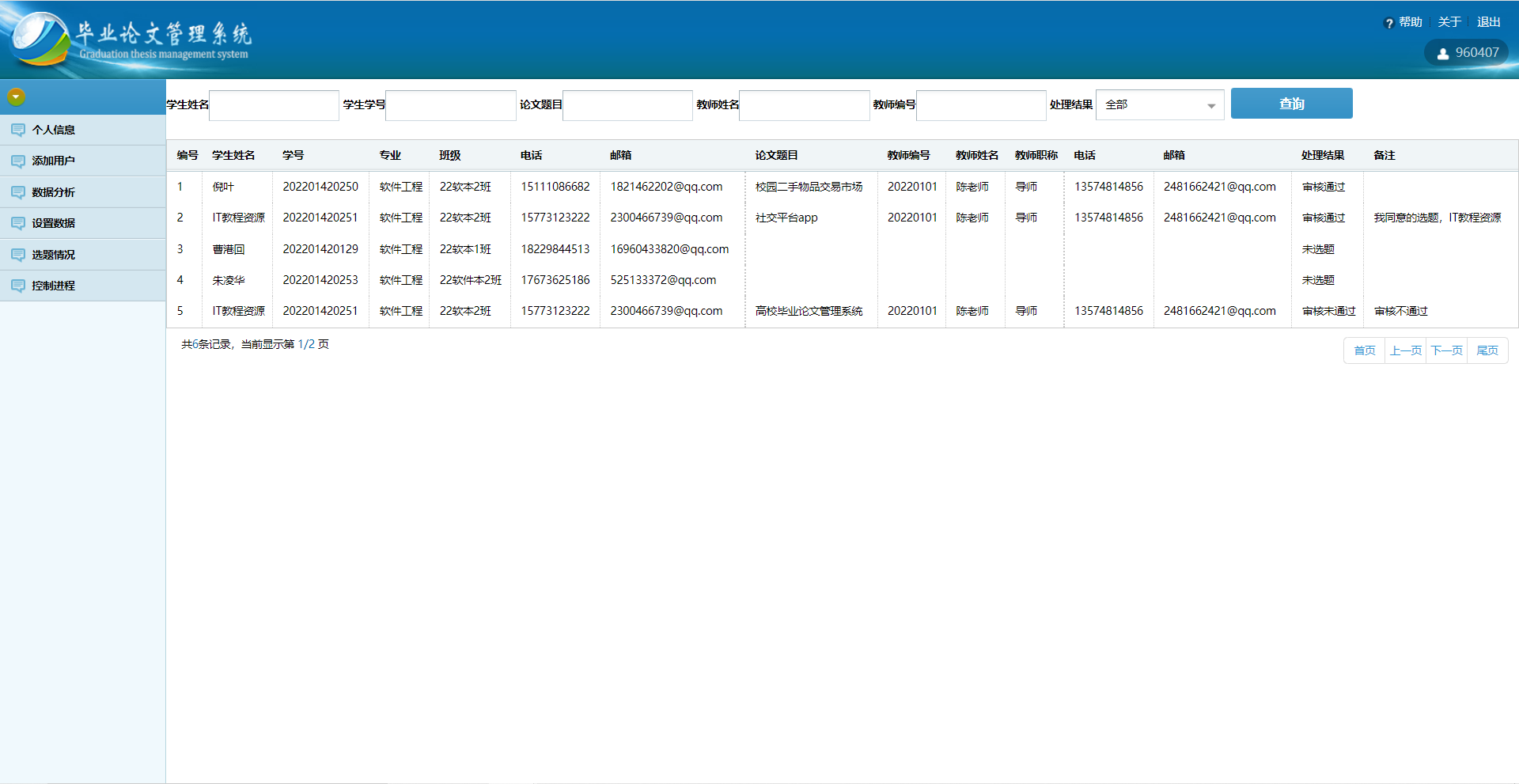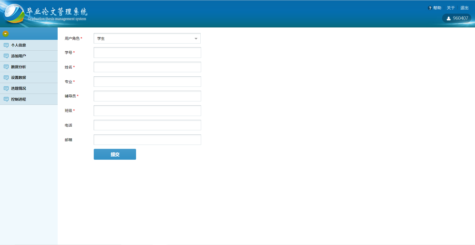 管理员模块:登陆、个人信息、添加用户、给定模板、设置数据、选题情况、进程控制